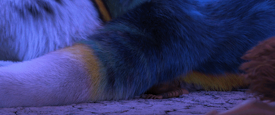 除了各有特点的人类角色,片中的稀奇古怪的史前动物也是令人目不暇接。一半野猫一半金刚鹦鹉血统的死亡大猫在上一部里没少给咕噜一家添乱,到了这一部里,则完全成了懂事听话的坐骑。盖用作腰带的树懒还是继续走甜宠路线;铁拳猴则是更显威武,它们特有的沟通方式让人拍案叫绝;由狼和蜘蛛混血而成的狼蛛乍看之下有点凶狠,但卖起萌来就跟哈士奇别无二致。其他如猪鳄、哞哞蛾、袋鼠穿山甲、公鸡海豹、独角鲸象等等异兽,都让人不由佩服主创团队强大的想象力。