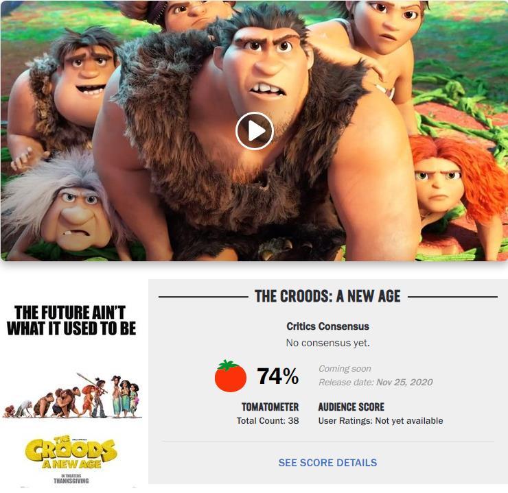 《疯狂原始人2》目前在“烂番茄”获得74%的好评度