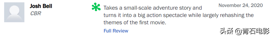 目前,《疯狂原始人2》在电影评论网站“烂番茄”上获得74%的好评度,已经超越第一部的72%好评度。《纽约》杂志的影评人Bilge Ebiri有感而发:“从前,我们说一部电影很能‘打发时间’,听上去不像什么正面的评价,但时至今日,这确实成了一种刚需。”