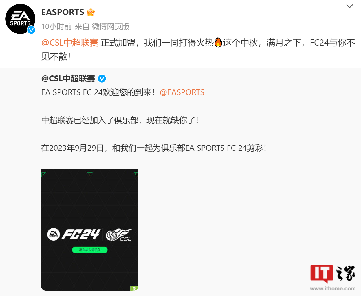 IT之家 7 月 14 日消息,CSL 中国足球超级联赛今日宣布,中超联赛将加入足球游戏《EA SPORTS FC 24》 。EA Sports 官博也转发了相关消息,并表示期待在中秋节(9 月 29 日)与玩家不见不散。