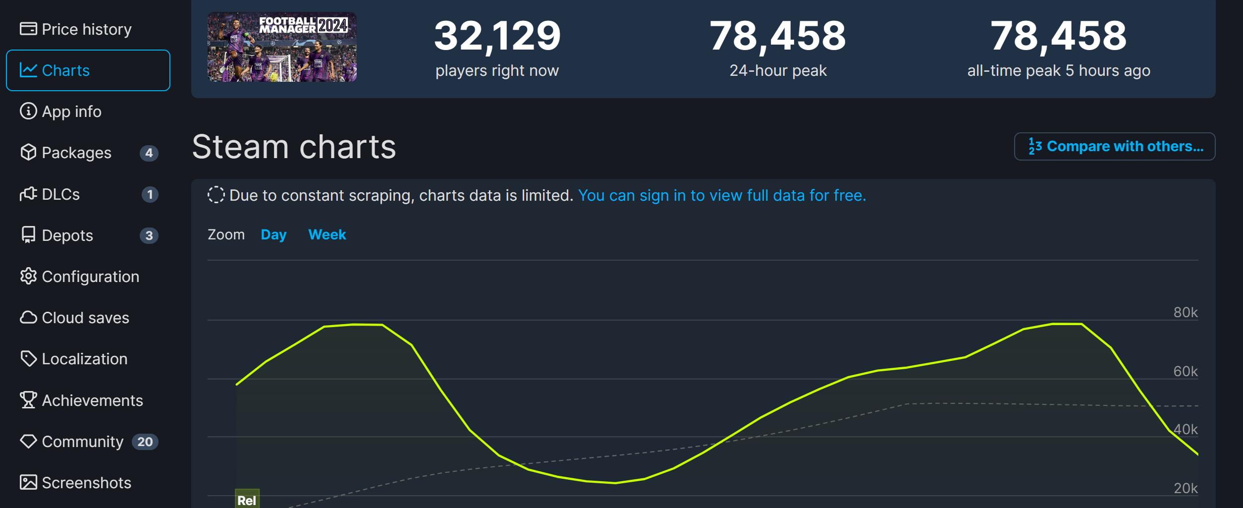 据SteamDB统计《足球经理2024》同时在线峰值78458人,尚未超过前作《足球经理2023》的在线峰值83715人。近几年的《足球经理》游戏都是首发加入微软Xbox Game Pass,这包括《足球经理2022》、《足球经理2023》以及今年的《足球经理2024》等。