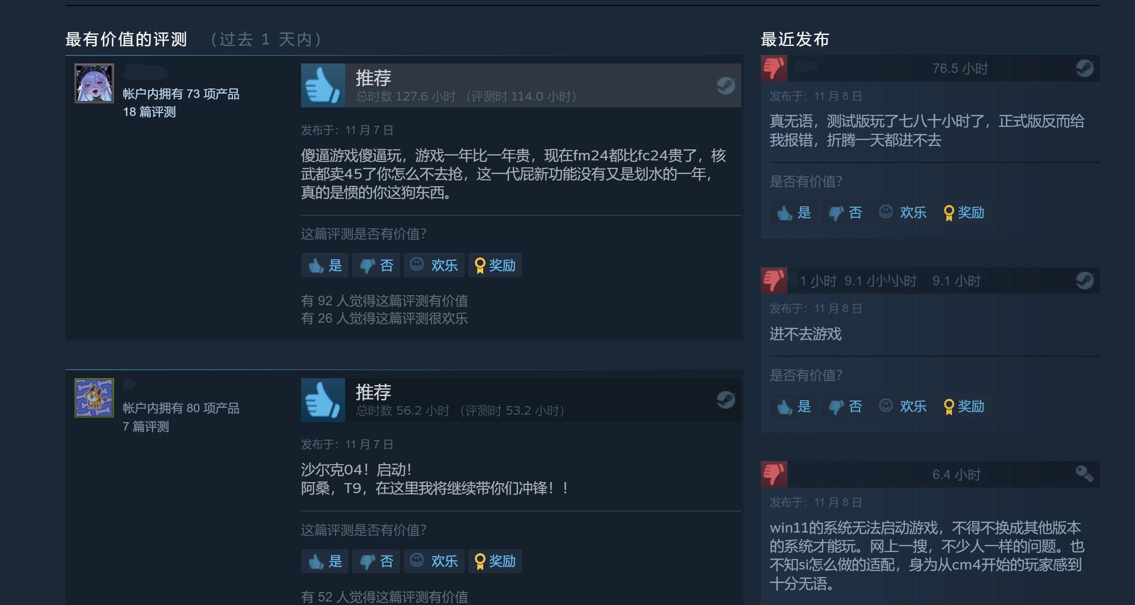 不过据Steam玩家反馈,有大量玩家反应进不去游戏。有玩家称“Windows11系统无法启动游戏,不得不换成其他版本的系统才能玩”,“玩了半个小时至今没能成功打开游戏”,“真无语,测试版玩了七八十小时了,正式版反而给我报错,折腾一天都进不去”。