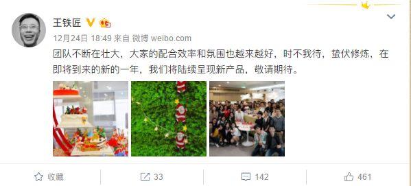 12月24日晚,王欣在微博上晒出了自己与公司员工聚餐的照片,并配文称: