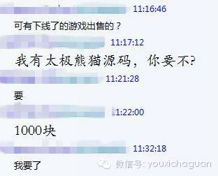 另外,在很多的技术交流群里也会有源码的出现。这些群的存在同贴吧论坛一样,不仅可以相互交流技术更可以共享资源。在某个QQ群里的聊天记录显示,《太极熊猫》的源代码只需要1000元即可交易。