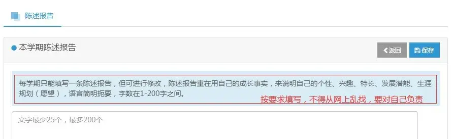 9.陈述报告(必填 ):每学期只能填写一条陈述报告,陈述报告重在用自己的成长事实,来说明自己的个性、兴趣、特长、发展潜能、生涯规划(愿望),或者说是自己对本学期的一个总结,语言简明扼要。