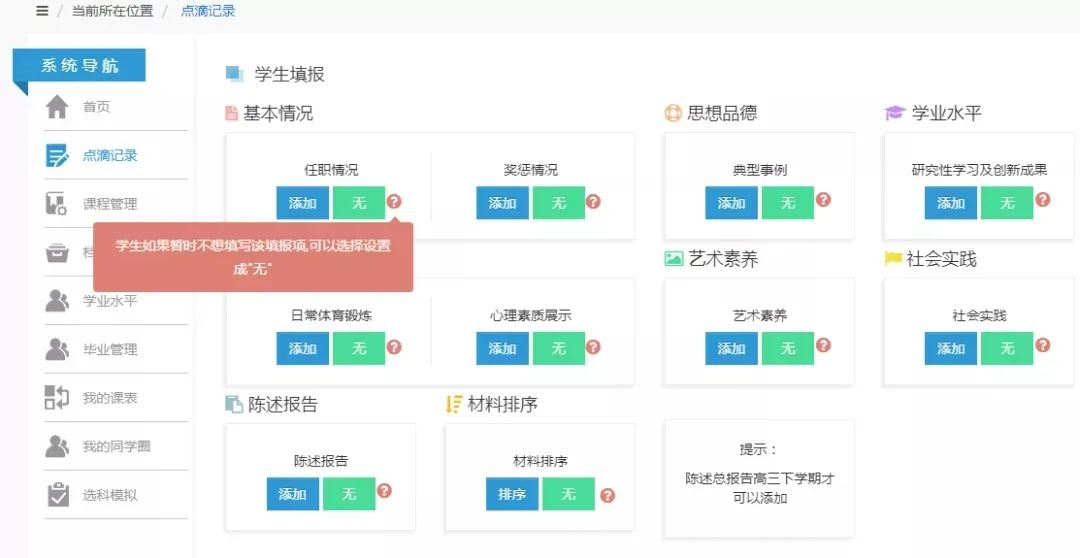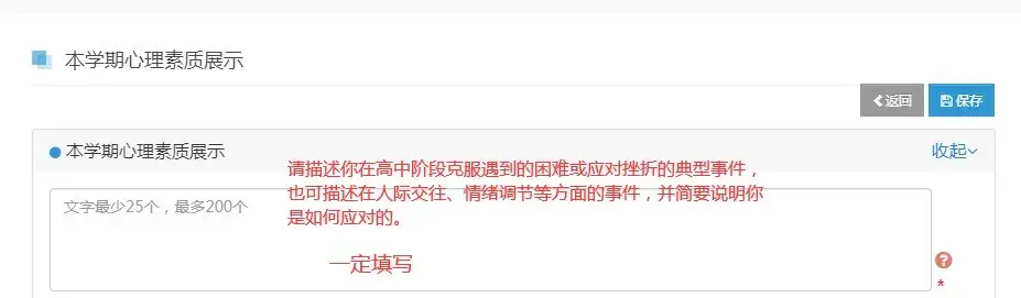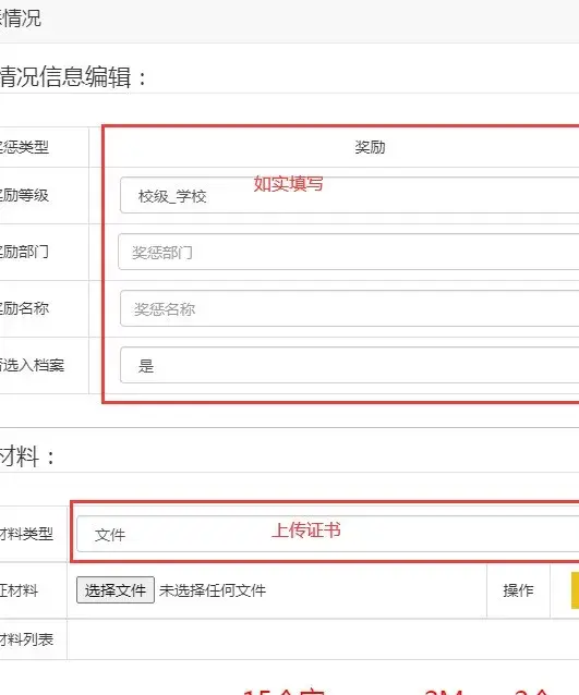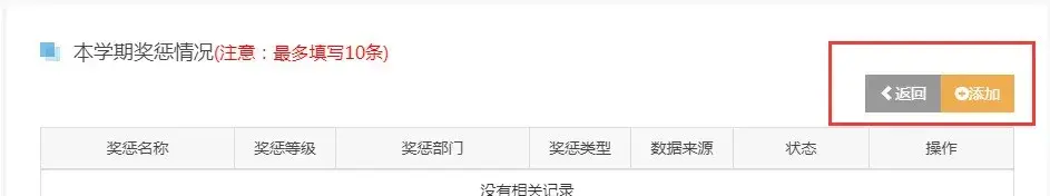 2.奖惩情况:有此项内容的学生需要填写(校级及其以上奖励与惩罚 ),如是艺术类获奖的应填在艺术素养中,这里不必填。通常奖惩情况全部由学生提交,能提供相关证书的最好(把证书拍照后在佐证中提交)。没有此项内容的学生填写“无”。