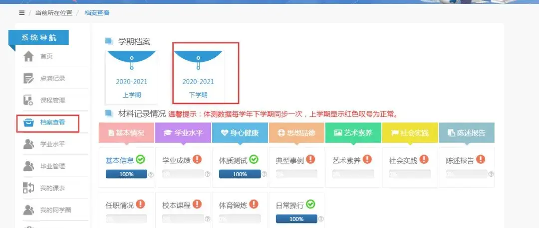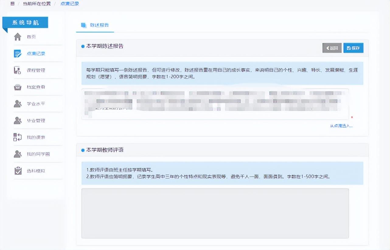 填写完成,可以从这里查看自己的填写情况,进入下学期后,还能看到自己的基本情况、学生评语等,非常详细。