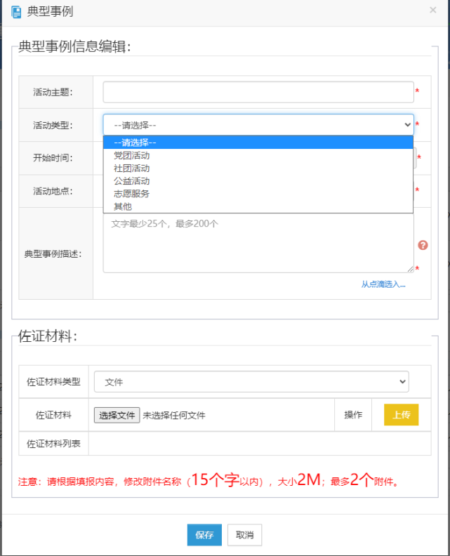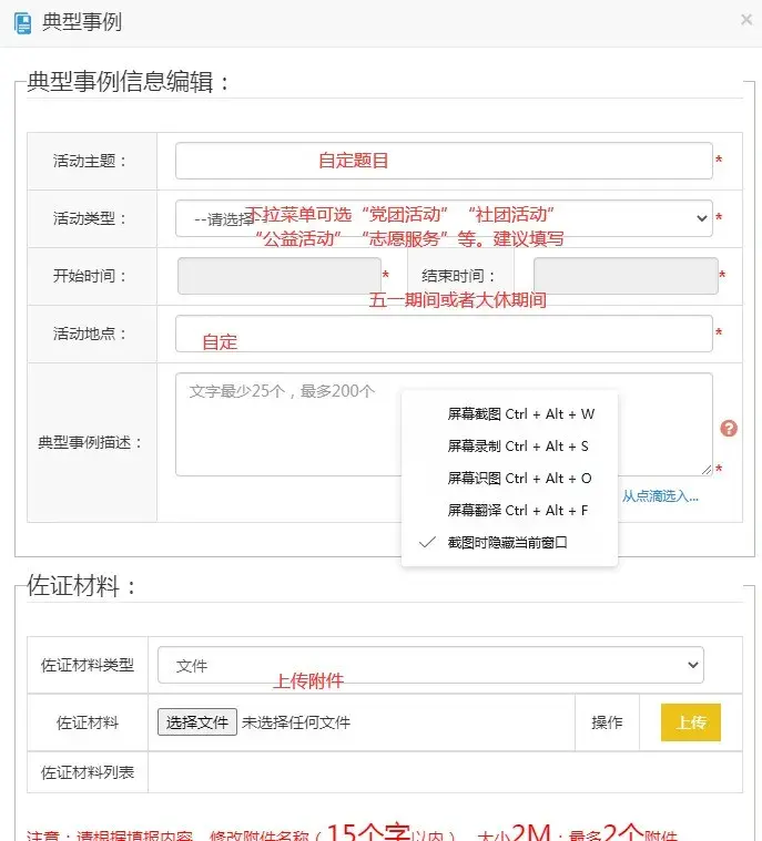 3.典型事例:指自己思想品德方面的,比如通过某件事自己的思想认识有了一个提高或改变,也可填写党团、社团、公益活动及志愿服务等能体现自己思想品德的事例。