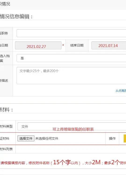 下图:任职情况填写,如实填写 ,佐证材料可用班级张贴的班干部表。