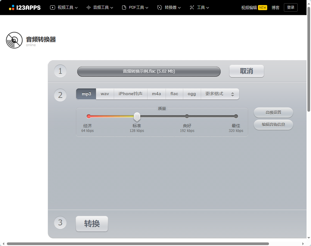 2、Online Audio Converter,Online Audio Converter是一个简单易用且功能强大的在线音频转换工具。它可以转换几乎所有常见的音频格式,包括MP3、WAV、FLAC等。该工具还提供了高质量的音频转换,转换速度快,不需下载任何软件。