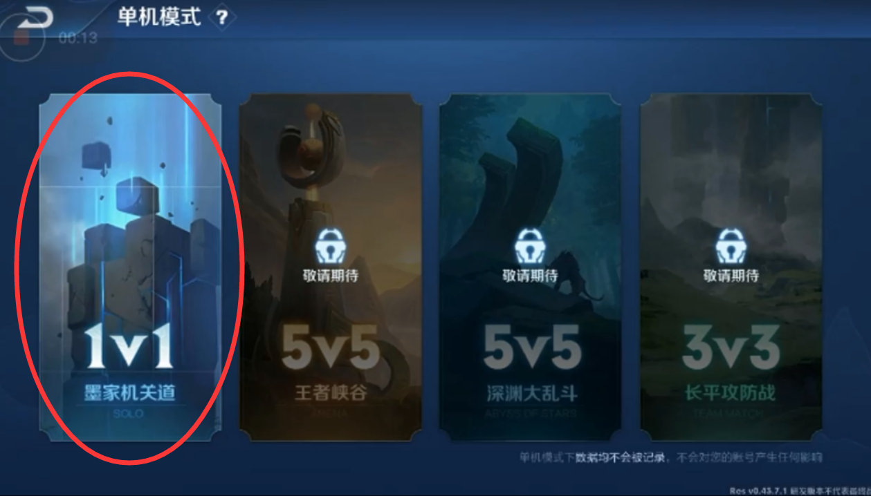 在不登入游戏的情况下,直接点击单机模式,就可以在不用联网的情况下,直接进入单人游戏模式,现在只开放了1V1玩法,进游戏后,直接满铭文。