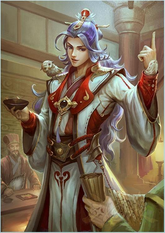 神诸葛亮的原画是根据《演义》中诸葛亮借东风的事件改编来,披头散发手持宝剑,都是与三国演义中描写诸葛亮借东风时的画面如出一辙。诸葛亮上空正是北斗七星,对应了技能“七星”,长头发向西飘散,证明东风已经借成,身后的火烧云也应该是周瑜在赤壁放火染红的。
