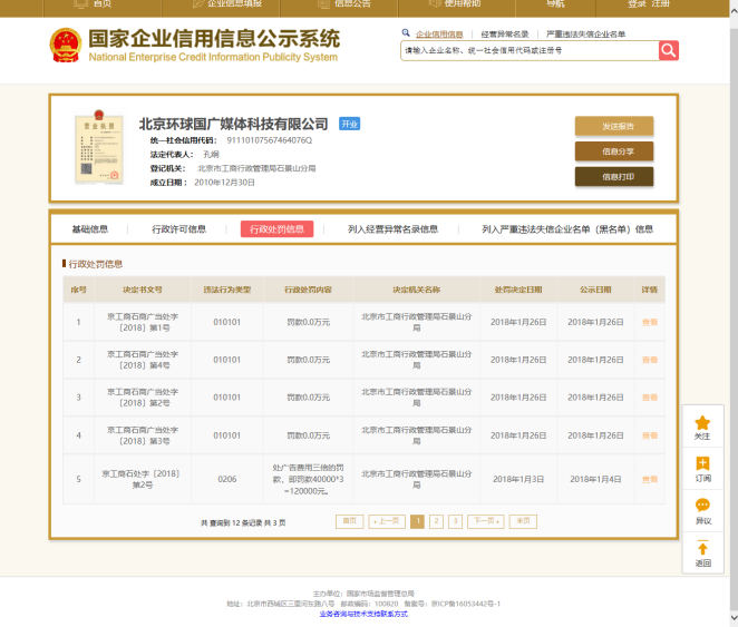 环球国广在其下设关联公司北京阅视聚鲨媒体科技有限公司设立的APP平台销售“帕卡原生态古树普洱茶尊享组”的广告里含有“降脂、减肥、养颜、降压、抗动脉硬化;具有杀菌消毒的作用;抗衰老”的广告用语,违反《广告法》,于2017年8月15日被北京市工商行政管理局石景山分局责令停止发布该违法广告,并罚款0.2万元。