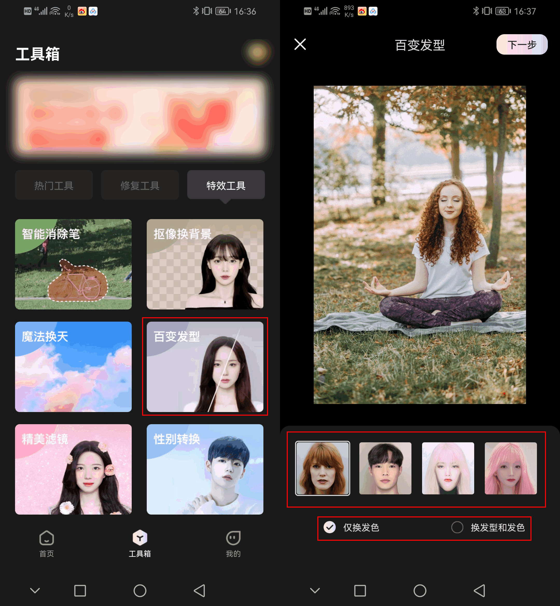 这里提供了不同的发色和不同的发型可以选择,大家根据自己的需要选择喜欢的,然后点击右上角的【下一步】就能看到前后的效果对比啦。