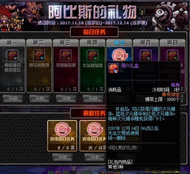 新的周常地下城有两个获取深渊票的方式:一个是每周一和周六开放的南部溪谷,每周能获得最多100张深渊票,另一个是每周五和周日开启的暗精灵试炼,收集400个黄色精华就能兑换一个低级史诗武器,分解掉就能得到一个史诗灵魂。
