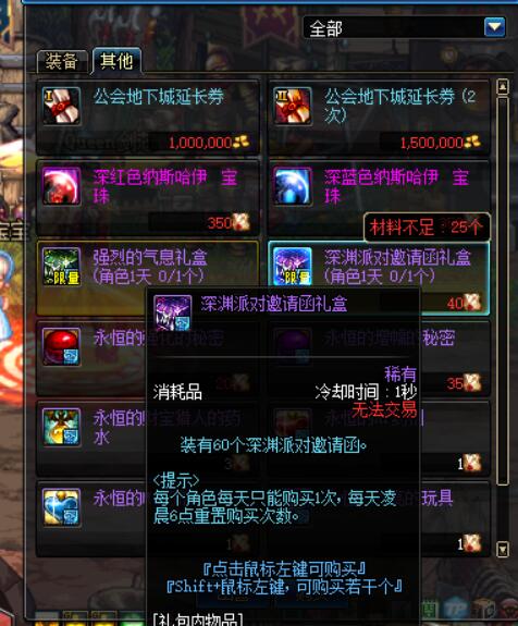 公会战开启后,每个赛季都可以使用银色勋章购买深渊派对邀请函,冒险团等级越高,可购买的邀请函也就越多,而且每天还能用公会贡献书兑换60张深渊票。