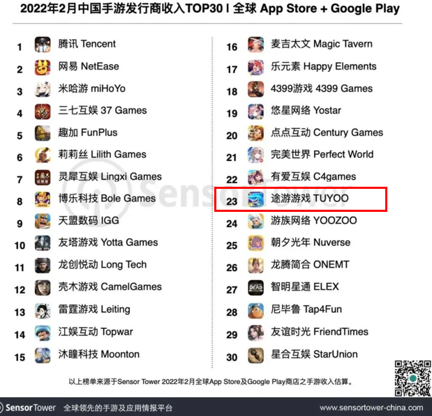 3月8日,Sensor Tower发布了《2022年2月中国手游发行商全球收入排行榜》。与往期相比,头部厂商的表现并无太多波澜,腾讯、网易和米哈游继续以TOP3之姿强势领跑,而《王者荣耀》、《和平精英》和《原神》也依旧展现着过人的吸金能力。