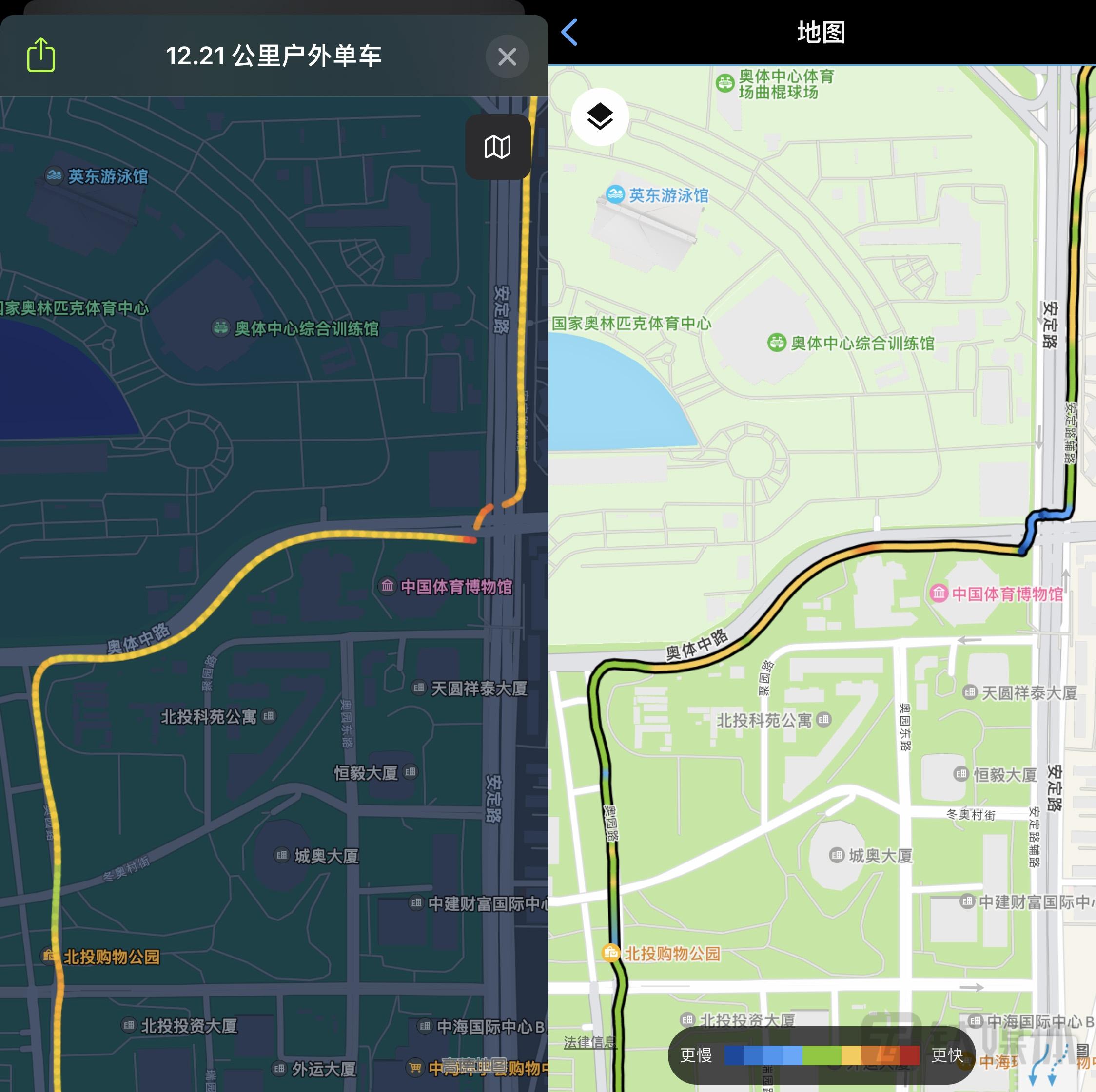 实际测试环节我们也对比了Apple Watch S7,功能上二者区别不大,但是在精度上,明显还是佳明更胜一筹。由于领跑者MARQ Athlete (Gen 2)采用了多频多星定位技术,定位可以更快更准,所以在记录轨迹上更加精确,全程没有因启停而产生断点。
