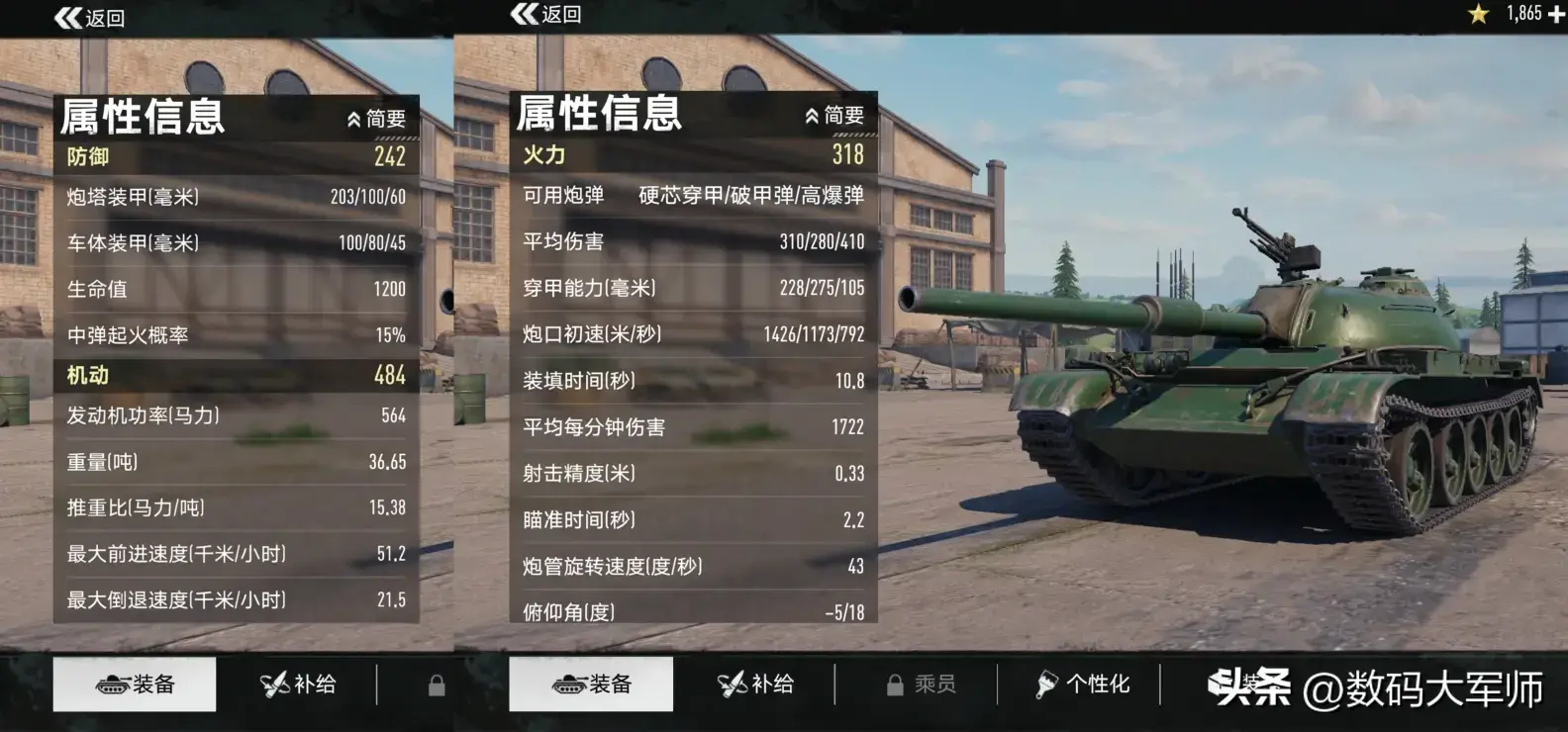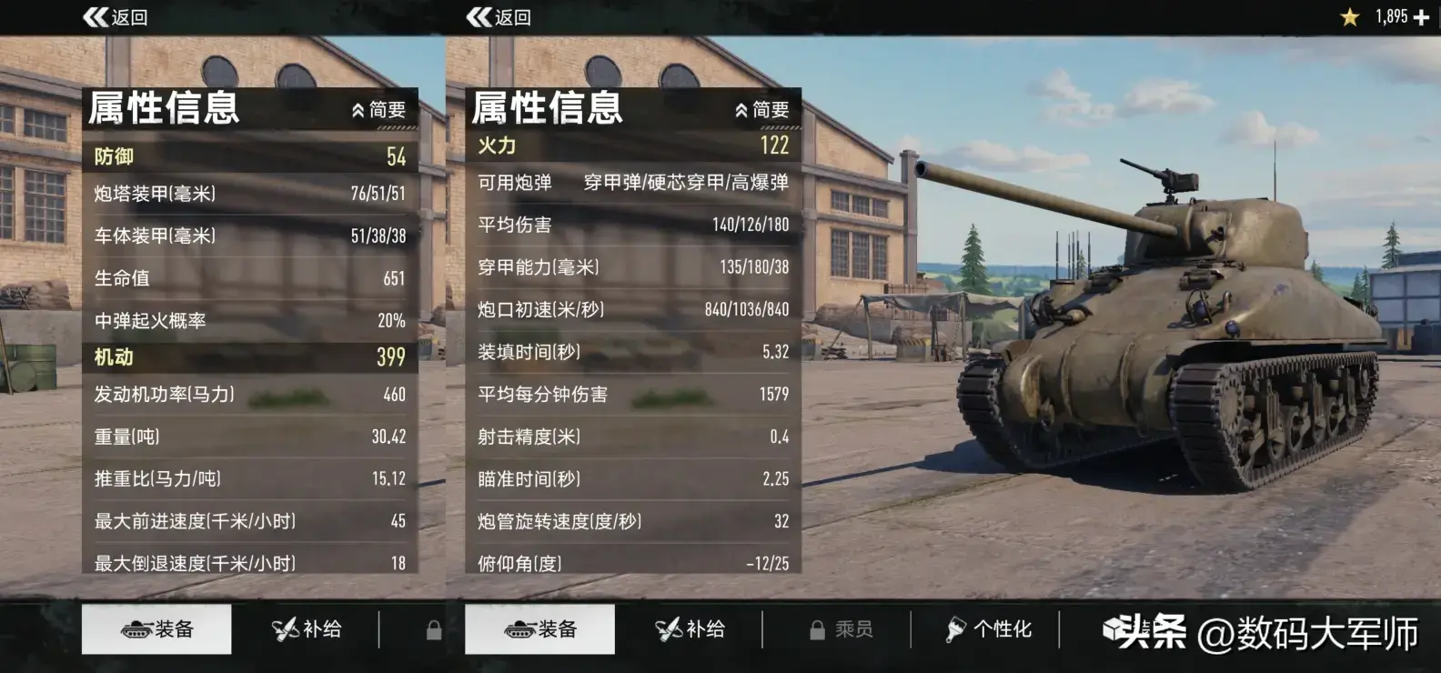 另外,我们还可以点击首页底部的坦克图标,进入坦克装备属性界面。这里可以认识不同坦克的相关属性信息,分别包括火力、防御、机动和侦察 ,每项属性下边都有具体详细的参数,通过数值可以对比坦克的强弱。