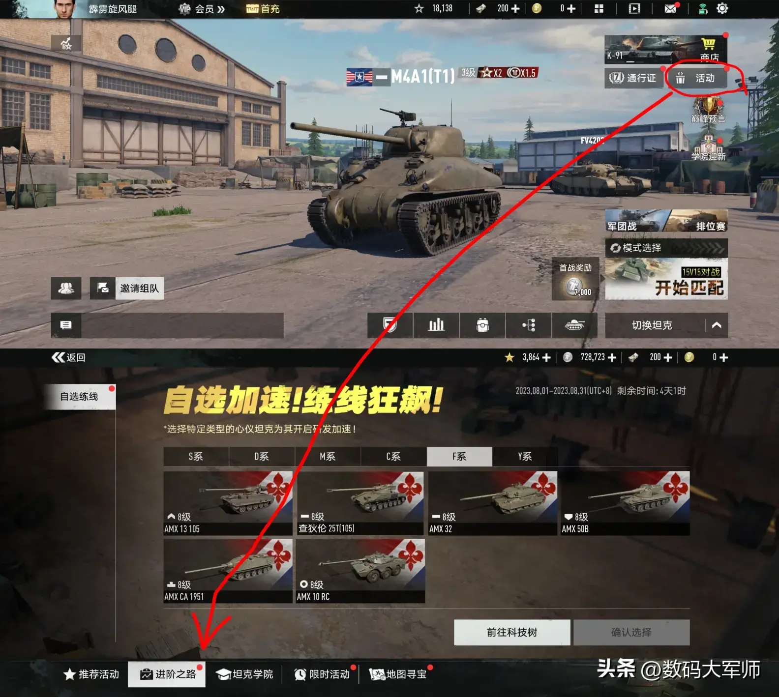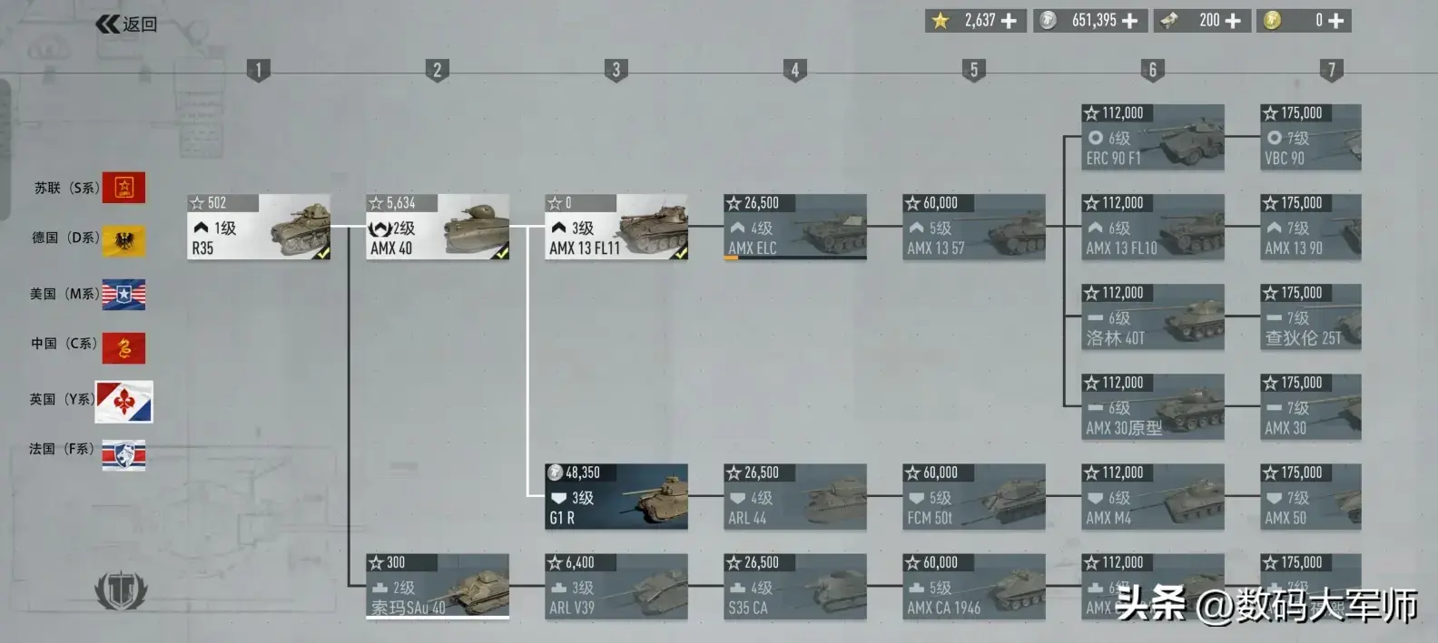 我们从坦克的科技树中,可以清楚的看到这六系坦克下,分别有哪些型号的坦克。而且每一种型号的坦克最高只有7级, 这个需要在游戏过程中不断用银币去研发升级。上图中六系坦克实际游戏中左侧只有各系的旗帜标识,文字是我自己加上去的。如果不能记住,还可以点击游戏首页的活动,然后再点击底部的进阶之路,就能看到对应旗帜的坦克派系,也是一目了然。
