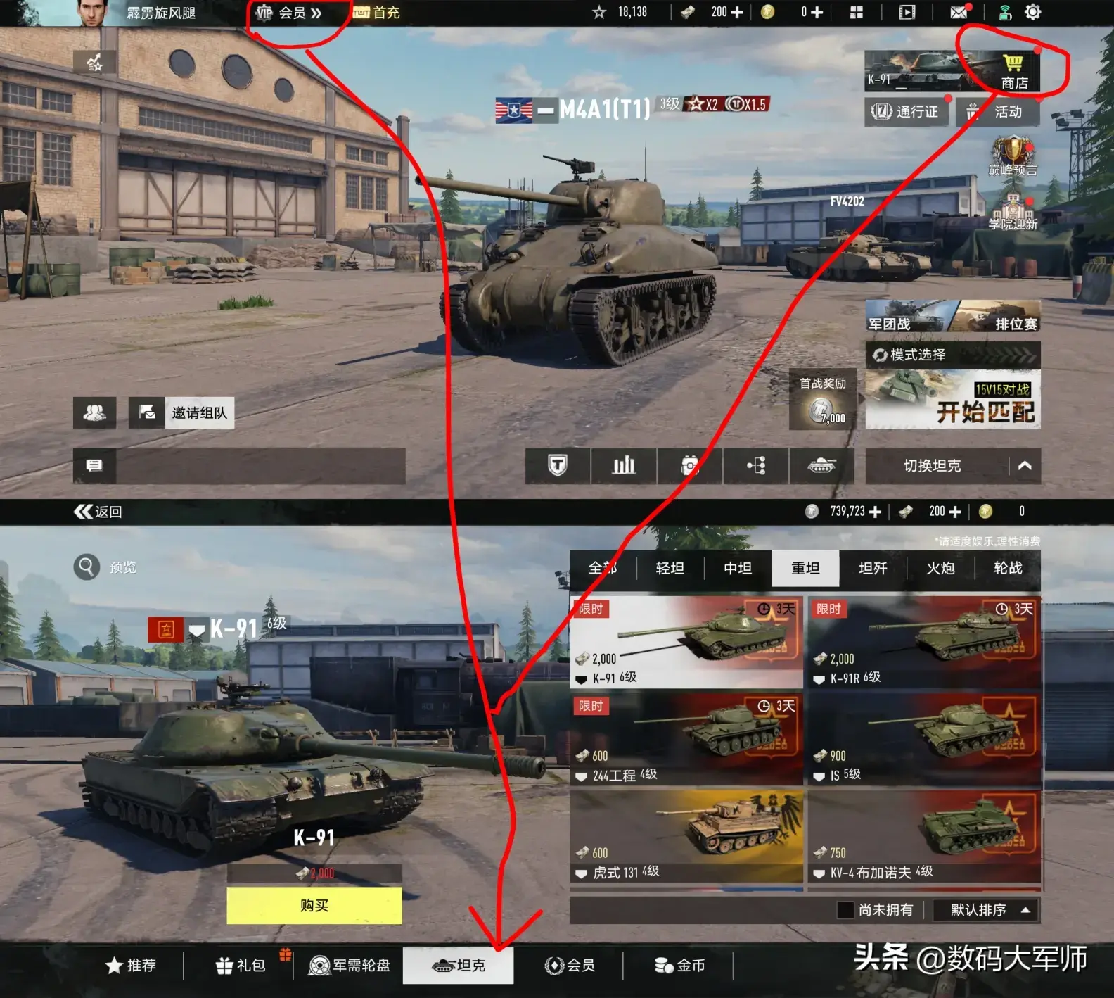 除了发解坦克的派系,其实更重要的还是要了解坦克的种类,因为不同类型的坦克有不同的作战需求。我们可以点击游戏首页的会员或商店选项,然后再点击底部的坦克选项,这个页面下有对轻坦、中坦、重坦、坦克歼击车(坦歼)、火炮以及轮战 的具体划分,这样你就可以清楚的知道哪个型号坦克属于什么类型。