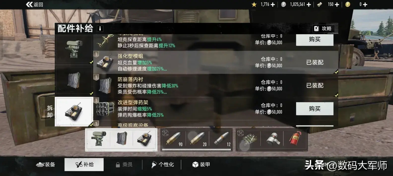 而配件补给和道具补给也是需要自己手动添加的,配件补给和道具补给里有很多选项,但分别只能添加3种补给。一般配件补给里我会选择改进型测距仪、改进型弹药架、强化型模组,这样分别能提高主炮瞄准效率、装弹速度和坦克血量。