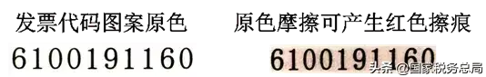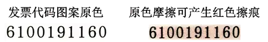 发票各联次左上方的发票代码使用防伪油墨印制,油墨印记在外力摩擦作用下可以发生颜色变化,产生红色擦痕(如下图所示)。