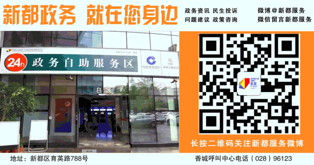 关注成都市新都区政务服务中心官方微信公众号、新浪微博账号“新都服务”,体验就在你身边的政务服务,办事更方便啦 ↓↓↓