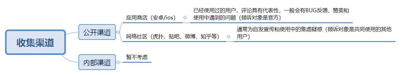 收集渠道主要为公开渠道(应用商店和网络社区)和内部渠道(暂不考虑)。