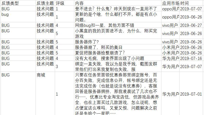 通过七麦、酷传中得到小米、华为、ios、OPPO、vivo五大应用市场中的用户反馈,时间段为6月1日至今(steam夏季促销期间)并经过剔除其中信息价值不高的正面反馈得出以下部分数据截图。