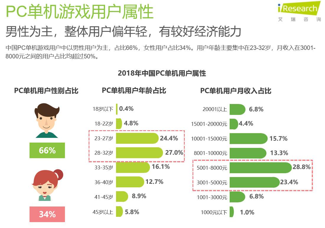 根据艾瑞咨询《中国PC单机游戏行业研究报告》显示中国PC单机游戏用户中以男性用户为主,占比66%,女性用户占比34%。用户年龄主要集中在23-32岁,绝大部分用户拥有着较高的收入。