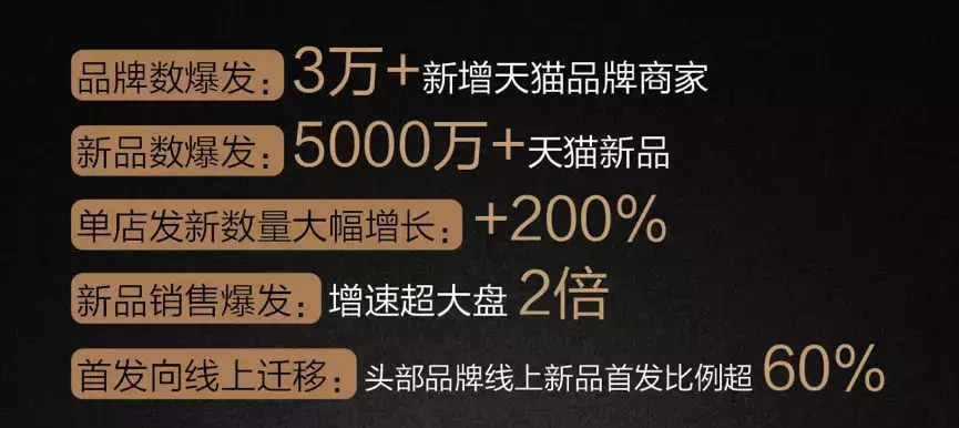 而从商业效果来看,据了解,2018年首发的5000万款新品中,有5000款成为超级新品,一款超级新品可占到店铺整体销售额的5%~30%。整体而言,天猫评选出的行业TOP100新品,其全年销售额占据大盘比例约20%,头部效应明显,得到新品者得天下。