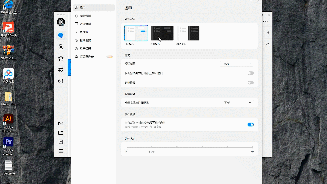 新版 QQ 的设置选项可以看到当下移动互联网产品的影子,比如设置中增加了夜间模式,可以更改字体大小,存储管理也变成手机上常见的直接显示文件占比和大小,用户不用自己进入文件夹,自己删减文件。