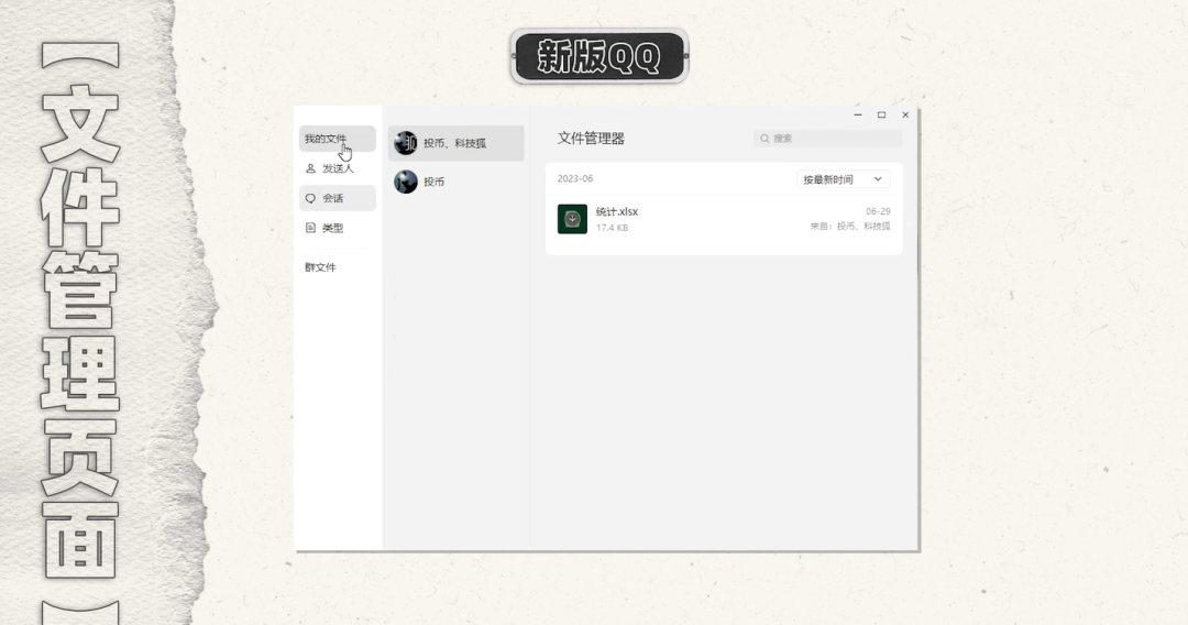 新版 QQ 的文件管理页面也经过优化,变得更加简洁易用,用户可以通过发送人,会话和类型来快速查找想要的文件,在新版 QQ 上能查看群里的群文件。