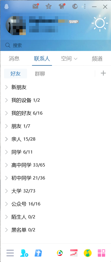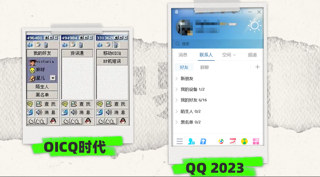 可以看出,在 2023 年的 QQ 用户界面上,仍旧还有当初 OICQ 的影子,上方和下方保留了各种功能入口,中间是联系人。