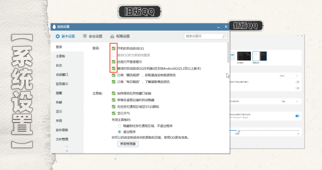 旧版 QQ 有很多设置现在看来非常繁琐,例如设置用户开机是否自动启动 QQ、启动 QQ 是否自动登录,登录时是否开启登录提示……它就像一个处处嘘寒问暖的家长,问多了难免让让人觉得啰嗦烦人。