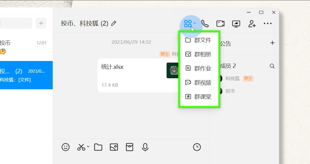 在群聊界面的右上角的群应用中,群文件、群课堂、群相册等为群组开发的功能依然得到保留,语音通话、视频通话、分享屏幕、远程协助与群应用,一同组成了一个适用于办公和校园的场景。
