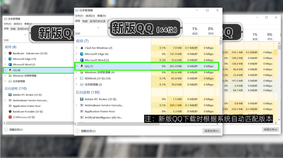 以上比较基于新旧版本都是 32 位,如果使用新版 64 位的 QQ,占用的内存会更高一些。