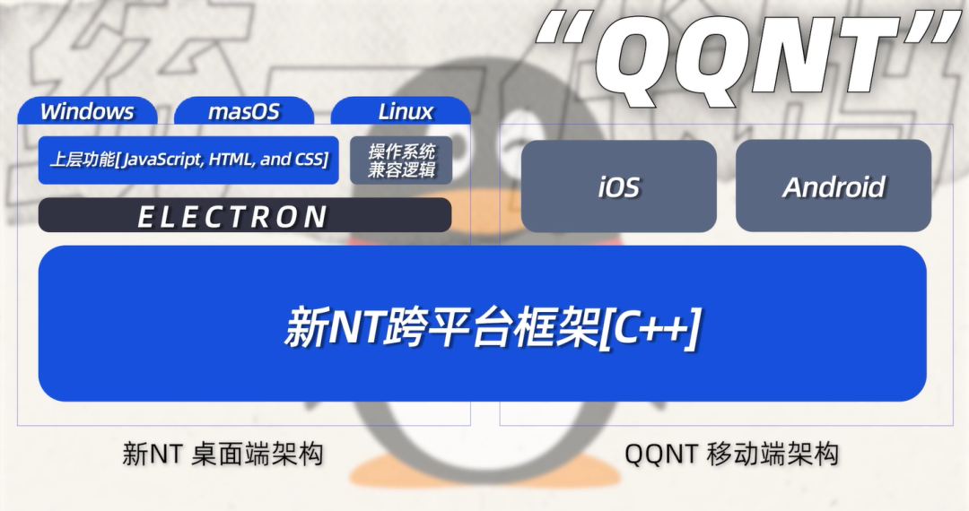 同一套代码能够在不同系统平台运行,这得益于新版 QQ 基于“QQNT”技术进行了一次全新重构,形成了通用的新NT跨平台框架,涵盖移动端和桌面端,进而推动后台的重构。