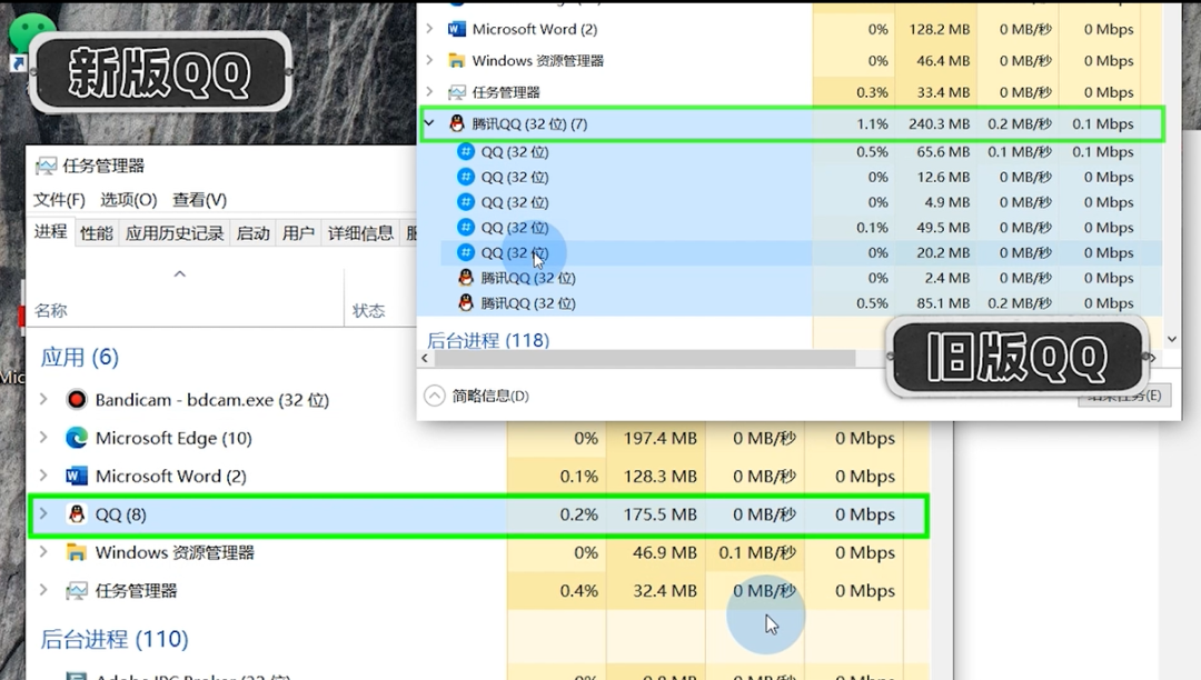 这与旧版 QQ 会自动启动频道进程有关,如果手动关闭频道进程,旧版 QQ 占用的内存则少于 90M。