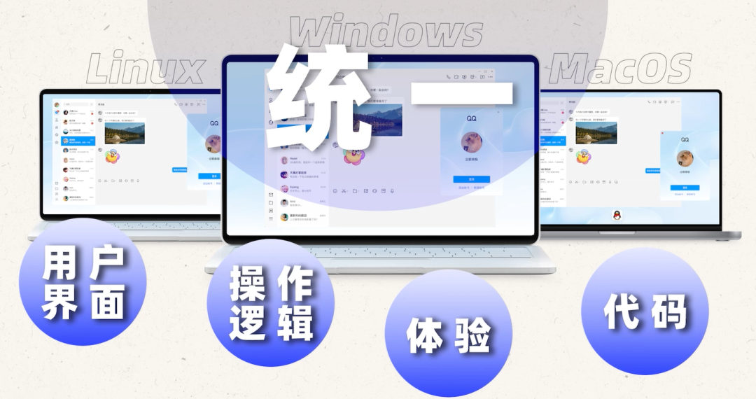 在桌面端,新版 QQ 基于 NT 技术,选择了 Electron 作为桌面版UI跨平台方案,Electron 兼容 MacOS、Windows 和 Linux 三个平台,实现了一套代码,多端运行,可以更高效地保持多平台客户端的升级迭代,给跨平台用户带来了一模一样的体验。