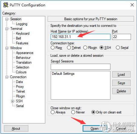 3.1 到百度搜索免费下载putty(win客户端)登陆器,安装后启动,输入路由器IP地址 192.168.31.1,点击OPEN