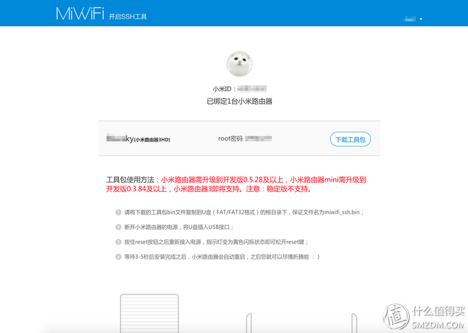 2.1 和手机一样,小米路由器的固件有稳定版和开发版两种,开发版支持开启SSH,稳定版不支持。到miwifi.com下载对应的开发版ROM。