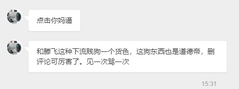 从骂我的人截图来看,滕飞老师肯定是把他拉黑了。但是我是没想到春卷老师这个好脾气的也拉黑了他。看来真的是臭大粪一坨。