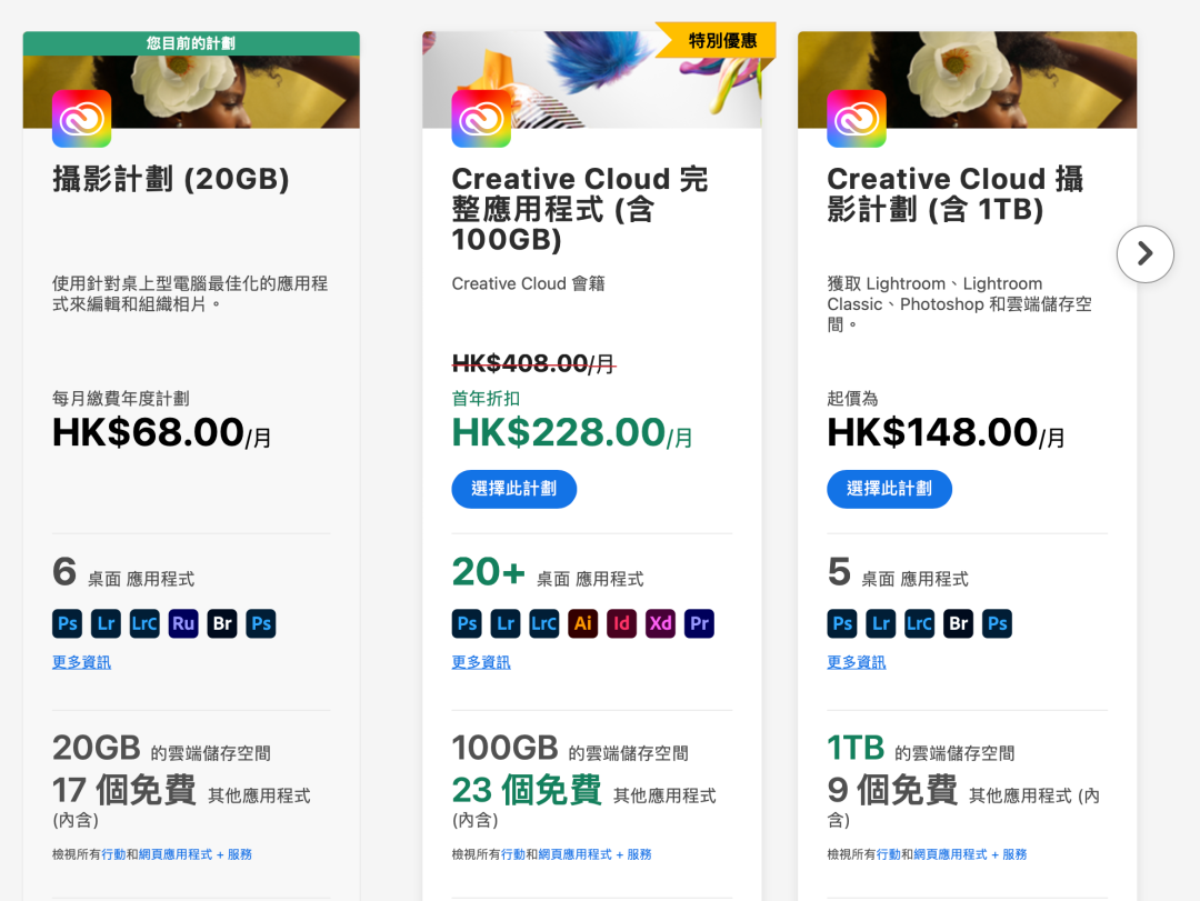 ▲ 香港地区的 Creative Cloud 摄影计划和其他套餐内容