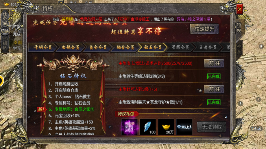 会员可以免费领取,到达相应的会员等级有专属的地图和称号,打怪获得元宝都会增加,让你快人一步称霸全服,前期主要切割伤害是打怪效率最好的办法,通过升级觉醒和时装可以提升大量切割伤害,打怪效率越高发育就越快。