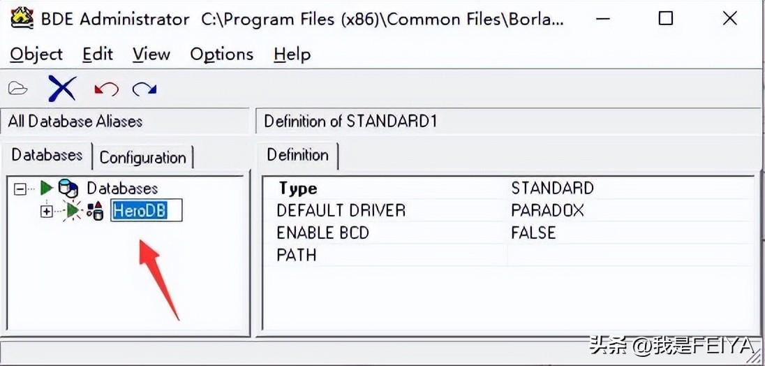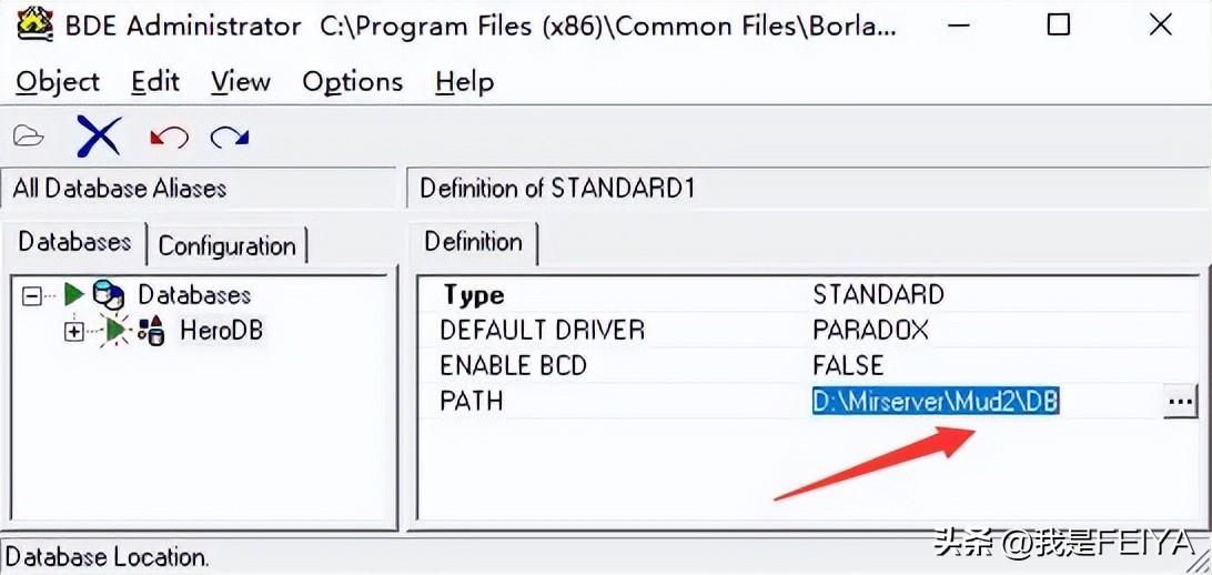 ③开始配置DBC2000,安装好DBC2000后,在你的电脑里面的控制面板(查看方式为小图标)里面会有一个DBE Administrator,打开之后右键空白部分new 新建一个数据库,重命名为HeroDB(大小写无所谓),然后右边设置路径D/Mirserver/Mud2/DB即可