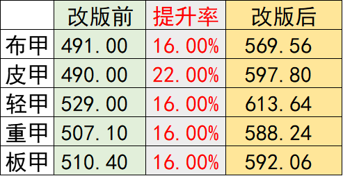 那么五套防具改版前后的提升率可计算为: