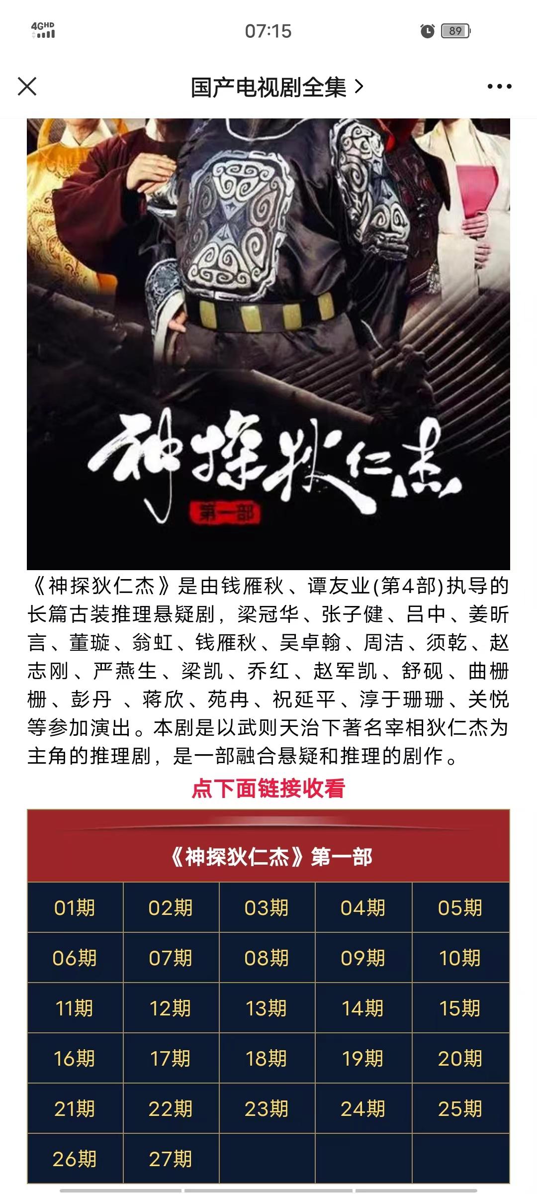 4、公众号视频合集免费 :在微信搜索“神探狄仁杰”即可看到合集资源。上面四部都有。手机播放也行,通过多屏互动APP投屏到电视也很好。