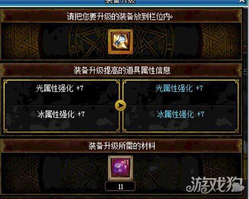 第二项就是装备升级, 升级后可以多出冰强+7, 当然了这只是其中一种装备, 其实还有很多样的, 比如说四维的装备,三速、力量、智力、属强的装备都可以供玩家自己选择。